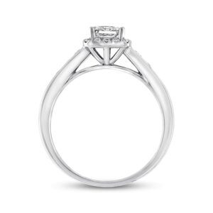 The center of this pretty engagement ring features a princess-cut diamond center resting in a glimmering frame of round diamonds. Additional round diamonds are in the 14K white gold band, bringing the total weight of the ring to 5/8 carat. From the Now & Forever? Bridal Collection.