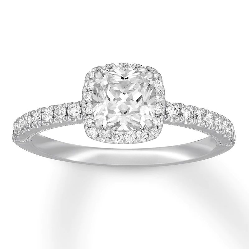 Celebrity jewelry designer draws inspiration from vintage designs to create styles that today’s brides love. This memorable engagement ring showcases a brilliant 1-carat, cushion-cut diamond center that shines in a halo of round diamonds. More round diamonds sparkle on the 14K white gold band to complement, bringing the total diamond weight to 1 1/4 carats.