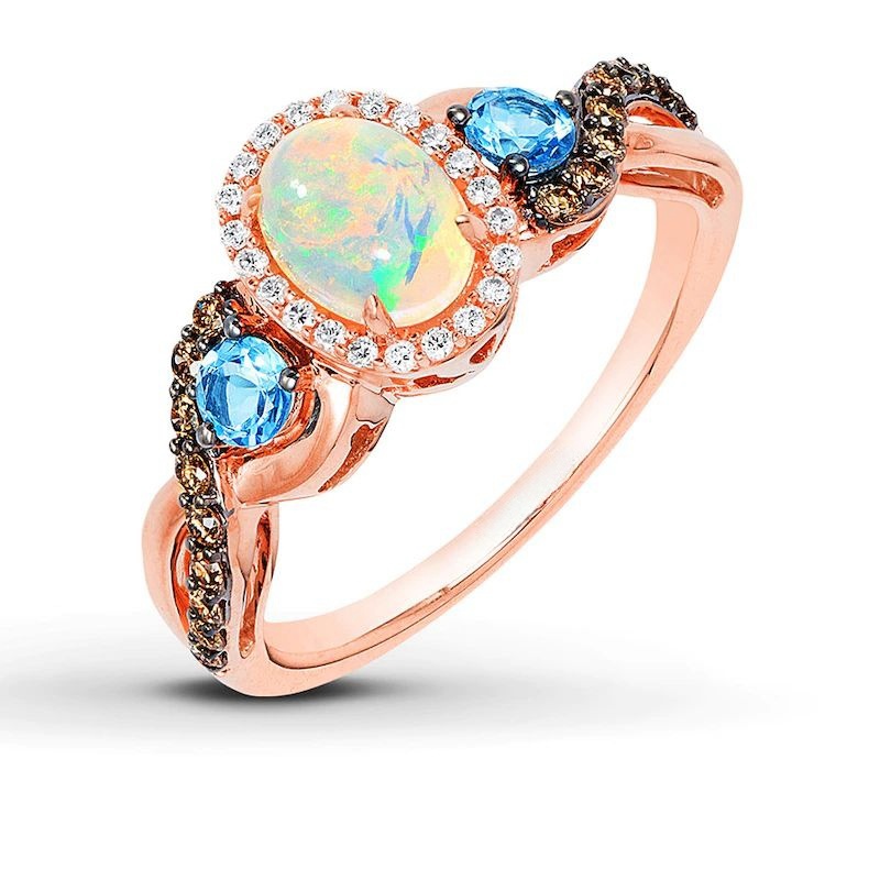An oval Neopolitan Opal nestled by a pair of round Ocean Blue Topaz swims along waves of Chocolate Diamonds? and Vanilla Diamonds? in this exquisite ring . Fashioned in 14K Strawberry Gold?, the ring has a total diamond weight of 1/4 carat. Discover the Legend. Please note: This ring is available in limited sizes. If you don’t see your size here, please visit a store to order your ring.